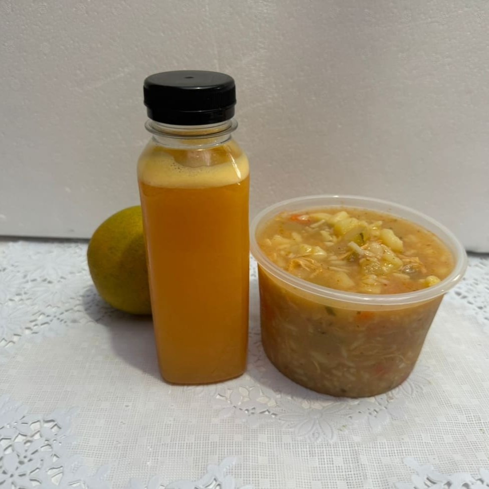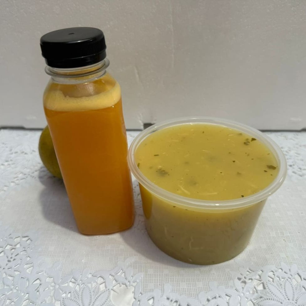 Combo Caldo De Batata C Frango 500ml + Suco De Laranja 300ml