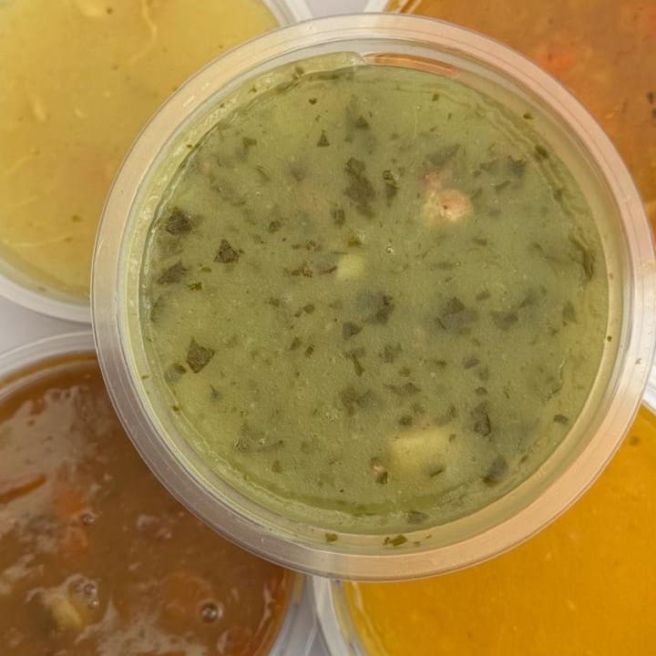 Caldo Verde: Batata, couve calabresa e bacon Canja: Frango desfiado batata cenoura e arroz ! Cada uma com 500 ml Nossas sopas já estão prontas então Não é possível retirar ingredientes.