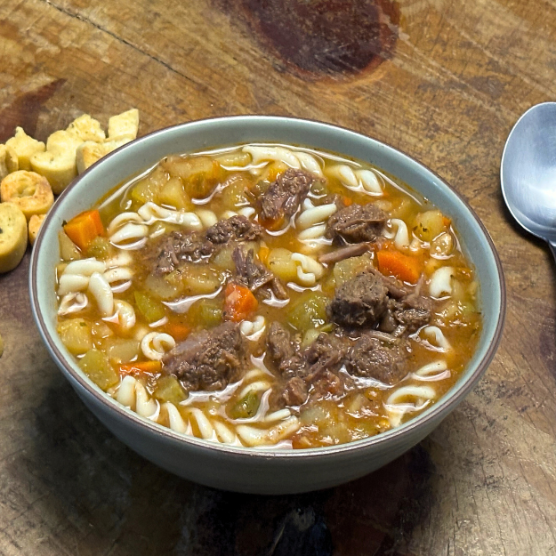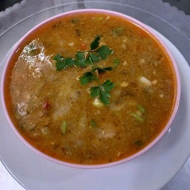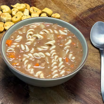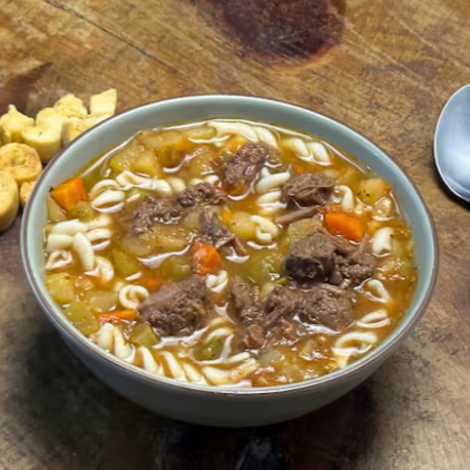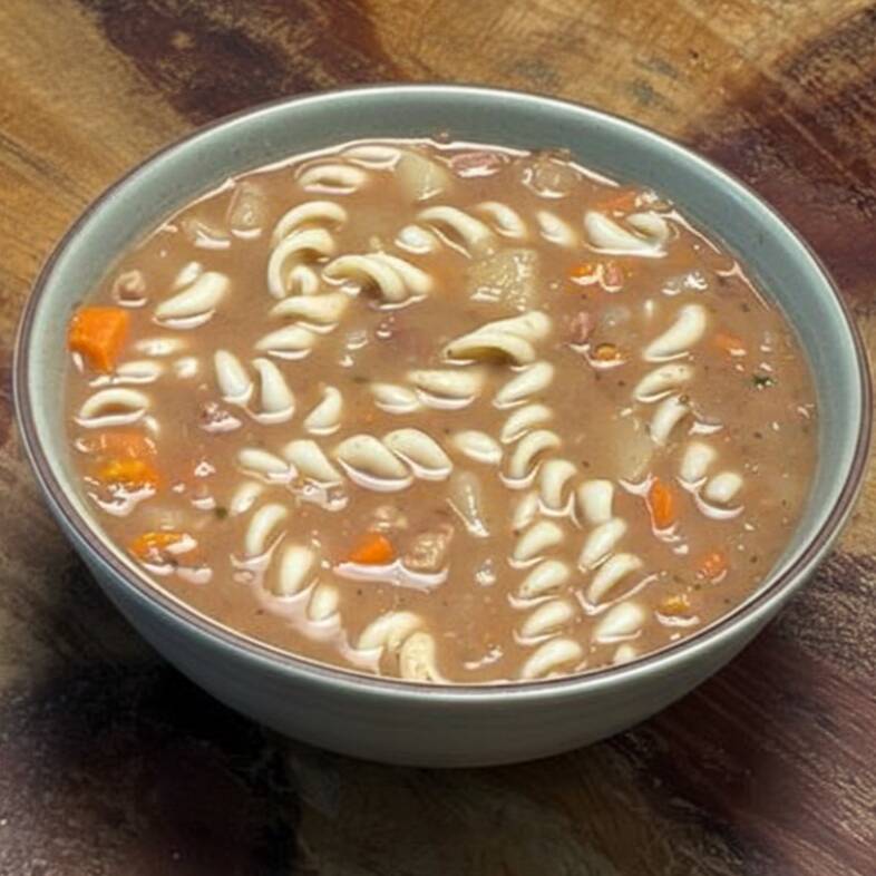 Legumes variados em pedacinhos com macarrão e carne bovina ! Leve 500 ml Quente! Nossas sopas já estão prontas então Não é possível retirar ingredientes.
