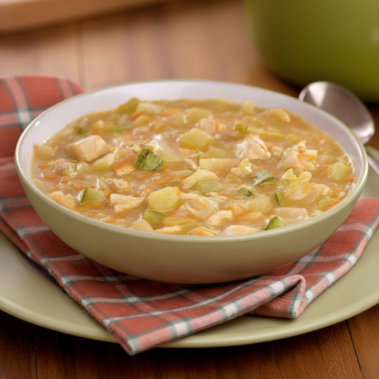 Galinha desfiada, arroz, cenoura, batata, chuchu e abobrinha e um temperinho caseiro bem gostoso! Nossas Sopas são feitas todos os dias e já estão prontas, por isso não é possível retirar ingredientes.