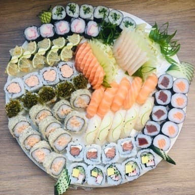 5 niguiri salmão, 5 Uramaki salmão, 5 Uramaki skin, 5 djou, 5 Shakemaki, 5 Kanimaki , 10 hot holl com cream cheese (serve 2 pessoas)