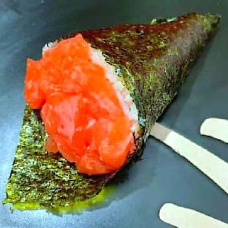 Arroz enrolando com alga Marinha, recheio pele do salmão grelhada, couve e tarê