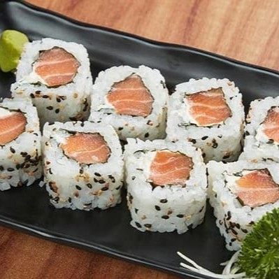 Arroz enrolando com alga Marinha, recheio salmão grelhado e cream cheese.