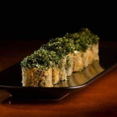 Arroz enrolando com alga Marinha, recheio salmão grelhado, cream cheese e crispe de batata.