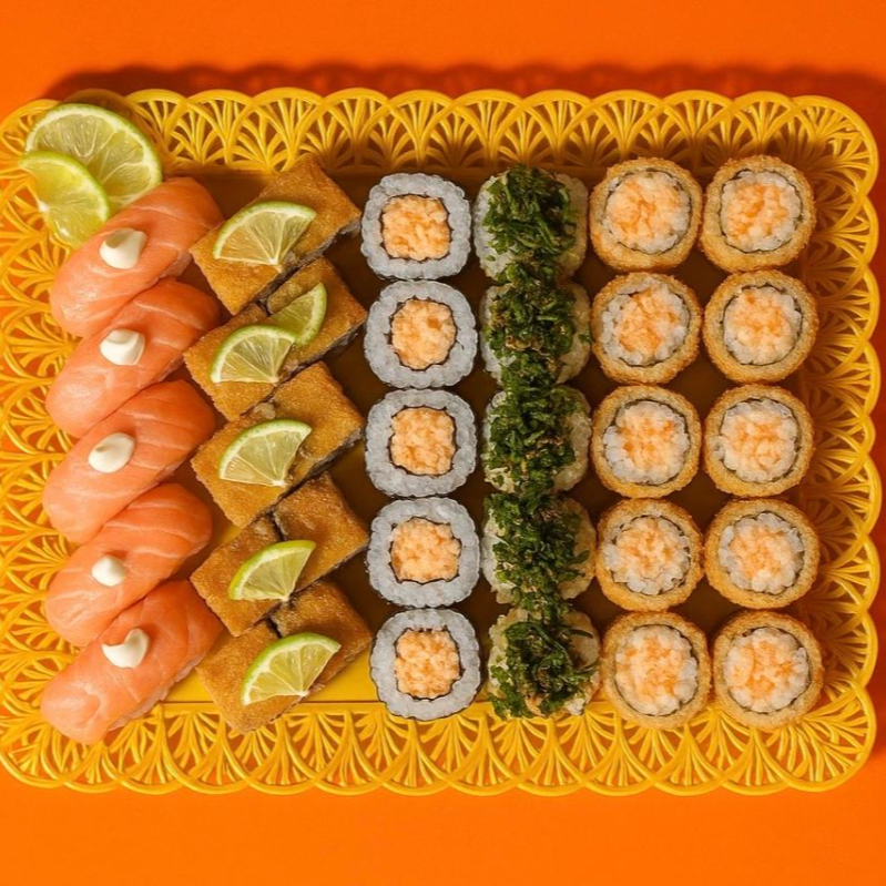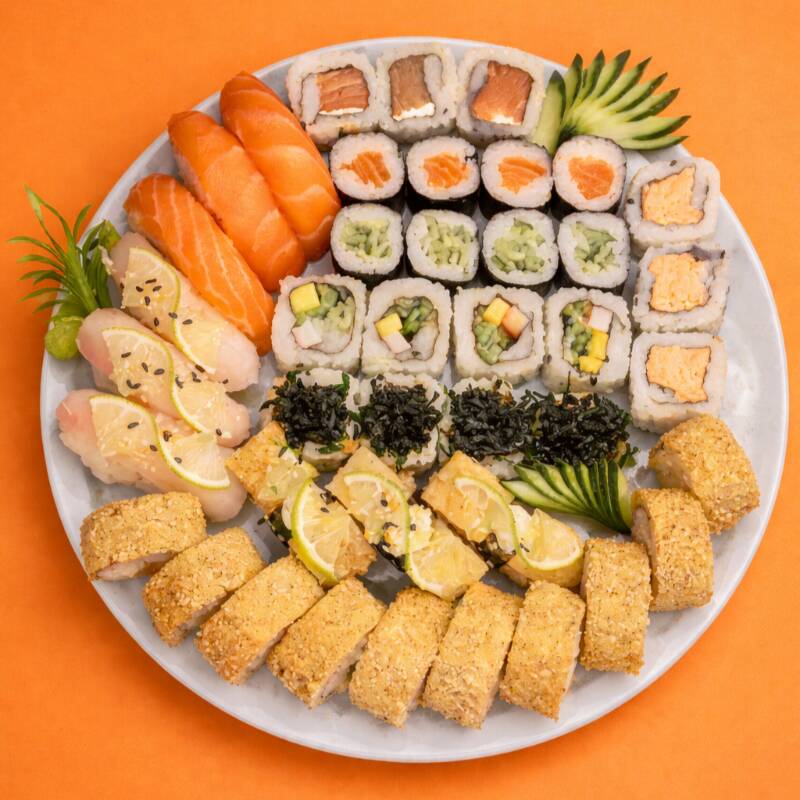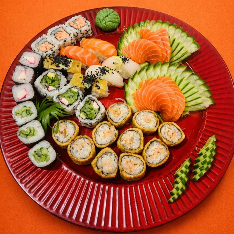 5 Niguiri salmão, 5 Niguiri tilápia, 4 Niguiri skin, 4 uramaki salmão, 4 uramaki Filadélfia, 4 uramaki Califórnia, 4 uramaki skin, 5 shakemaki, 5 tekamaki, 5 Kani, 5 kapamaki, 10 hot holl. Obs. Não fazemos alterações (serve 4 pessoas)