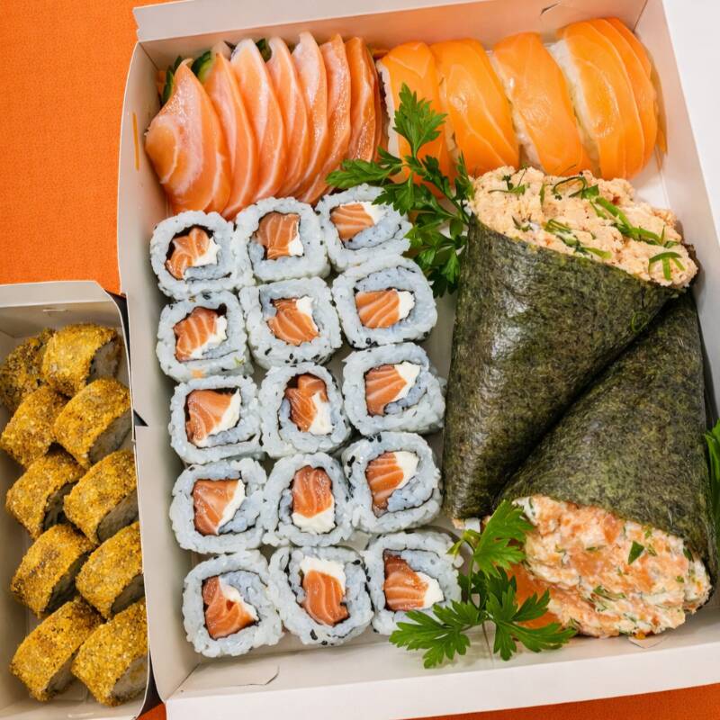 8.sashimi salmão 1.temaki salmão A (cream cheese, cebolinha.) 1.temaki philadelfia (cream cheese, cebolinha.) 4.niguiri salmão 15.uramaki salmao 10.hot holl salmão Obs. Não fazemos alterações. Bom apetite! (serve 2 pessoas)