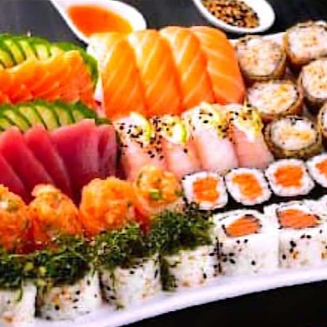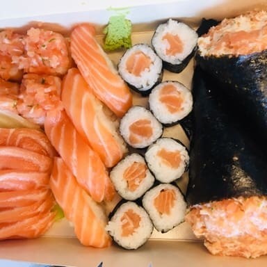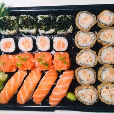 5 niguiri salmão, 5 Uramaki salmão, 5 Uramaki skin, 5 djou, 5 Shakemaki, 5 Kanimaki , 10 hot holl com cream cheese (serve 2 pessoas)