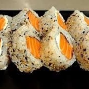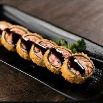 Arroz sobre a alga Marinha enrolando no salmão grelhado com cream cheese e empanado na farinha panco e frito.