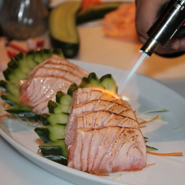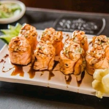 Um Magnífico combo de sushis maçaricados…: 10.Niguiris salmão, maçaricado, cream cheese, crispe de batata, gergelim e molho tarê. 8.Uramaki red, maçaricado, cream cheese, crispe de batata e molho tarê. 5.Djou maçaricado, recheio de cream cheese, crispe de batata e molho tarê. 5.Djou couve maçaricado, recheio de cream cheese, crispe de couve e molho tarê. 4.Sushi boll maçaricado, sem arroz, rechei