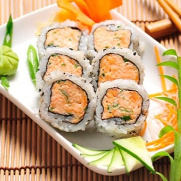 Arroz enrolando de salmão com recheio de salmão batido e cebolinha.