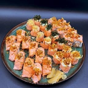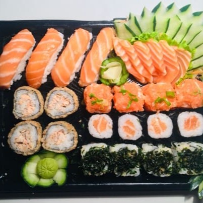 6.Sashimi salmão 4.Niguiri salmão 4.Ura salmão 4.Shakemaki 2.Djou 4.Ura skin 4.Niguiri skin (serve 2 pessoas)