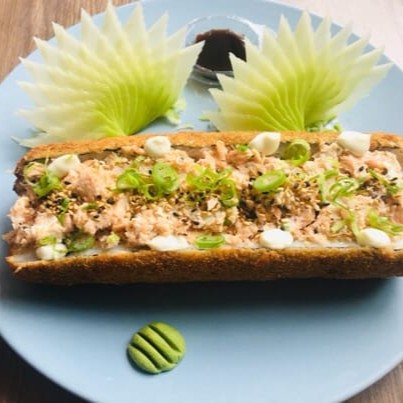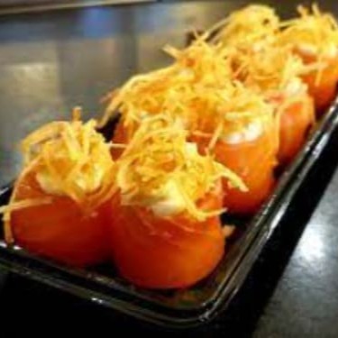Hot frito, empanado na farinha panko e aberto, recheio salmão grelhado, cream cheese, cebolinha, gergelim e molho tare.