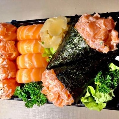 4.Sashimi salmão 4.Niguiri salmão 4.Djou 8.Shakemaki (serve 1 pessoas)