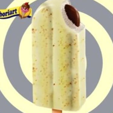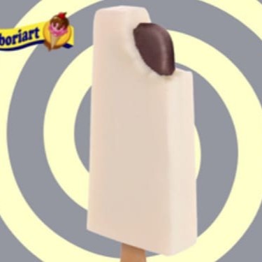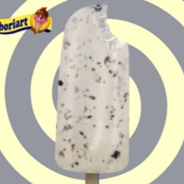 Delicioso sorvete sabor baunilha com recheio sabor chocolate e cobertura sabor chocolate branco com farofa de amendoim