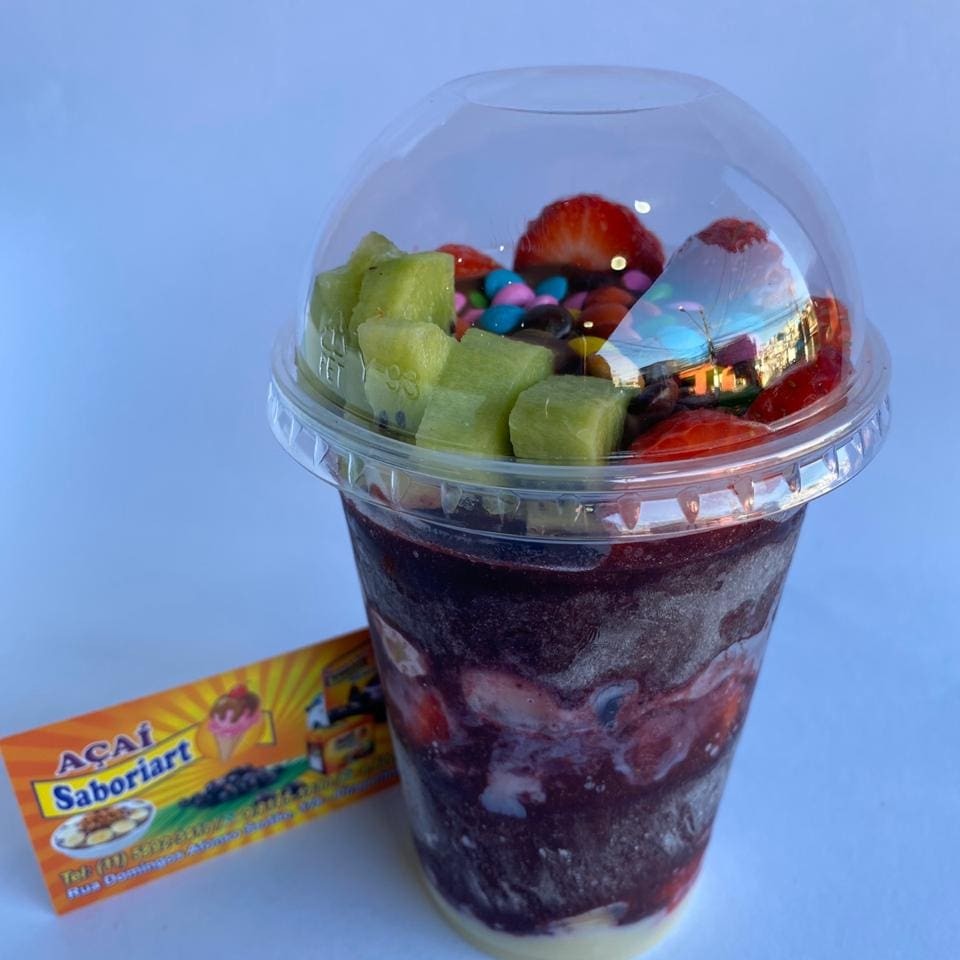 Delicioso açaí 500 ml direito a duas frutas, um cereal e uma calda.