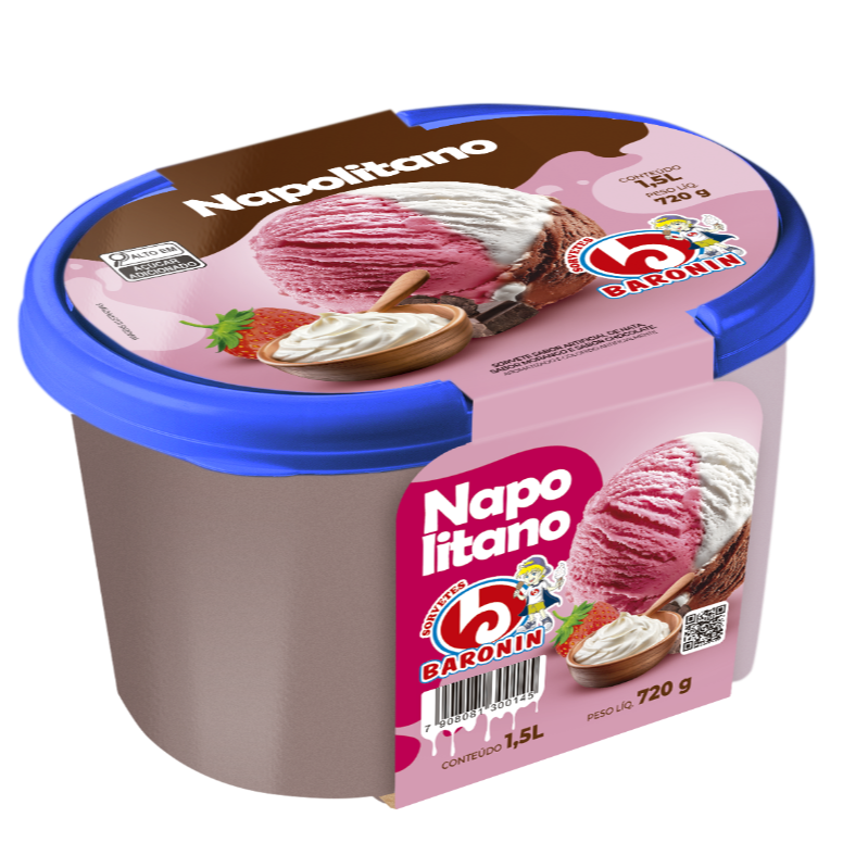 Sorvete Napolitano 1,5 Litros super cremoso, com a combinação clássica de chocolate, morango e creme. Perfeito para compartilhar, refrescar o Dia e agradar todo mundo em cada colherada!