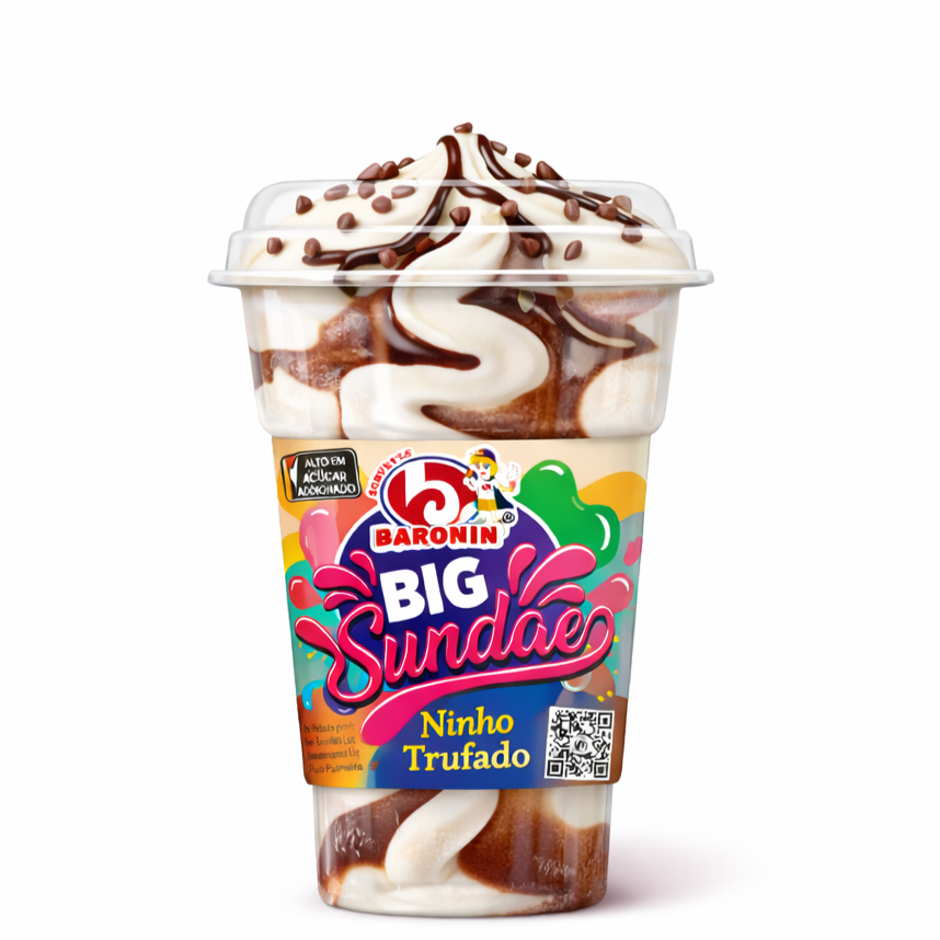 Cremoso sorvete sabor leite Ninho combinado com generosas camadas de calda trufada de chocolate. Finalizado com cobertura de chocolate e granulados crocantes, criando uma sobremesa rica, cremosa e irresistível para quem ama a combinação de leite Ninho com chocolate.