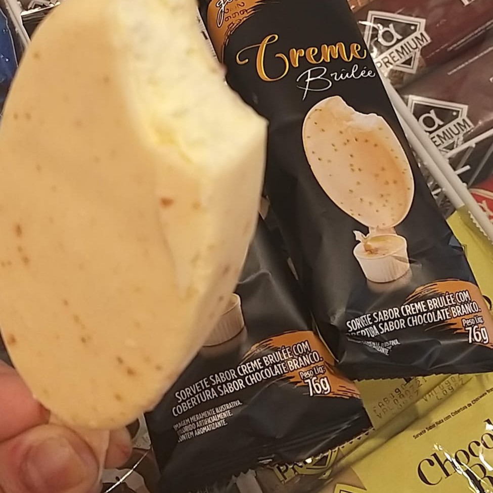 Cremoso sorvete sabor creme brulee com cobertura de chocolate branco. Surpreendente sabor!