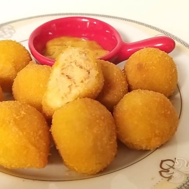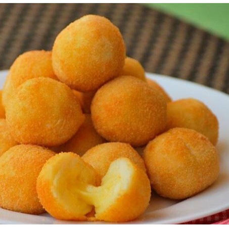 Delicioso mini bolinho de queijo. Já frito! Basta aquecer no forno ou fritadeira eletrica e servir. Aprox. 20 unidades