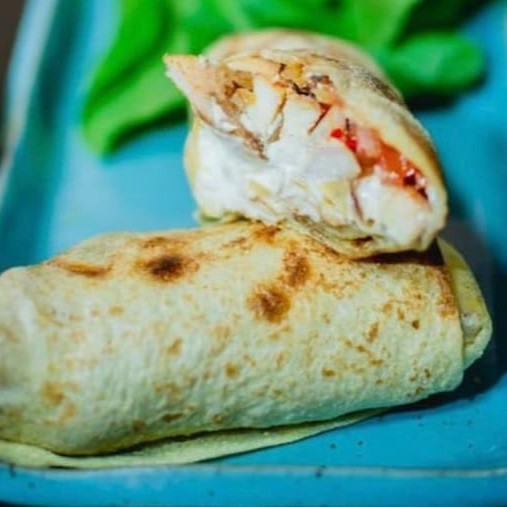 Sanduíche libanês com filé de frango cortado em tiras, coalhada seca e vinagrete, enrolados no nosso delicioso pão folha