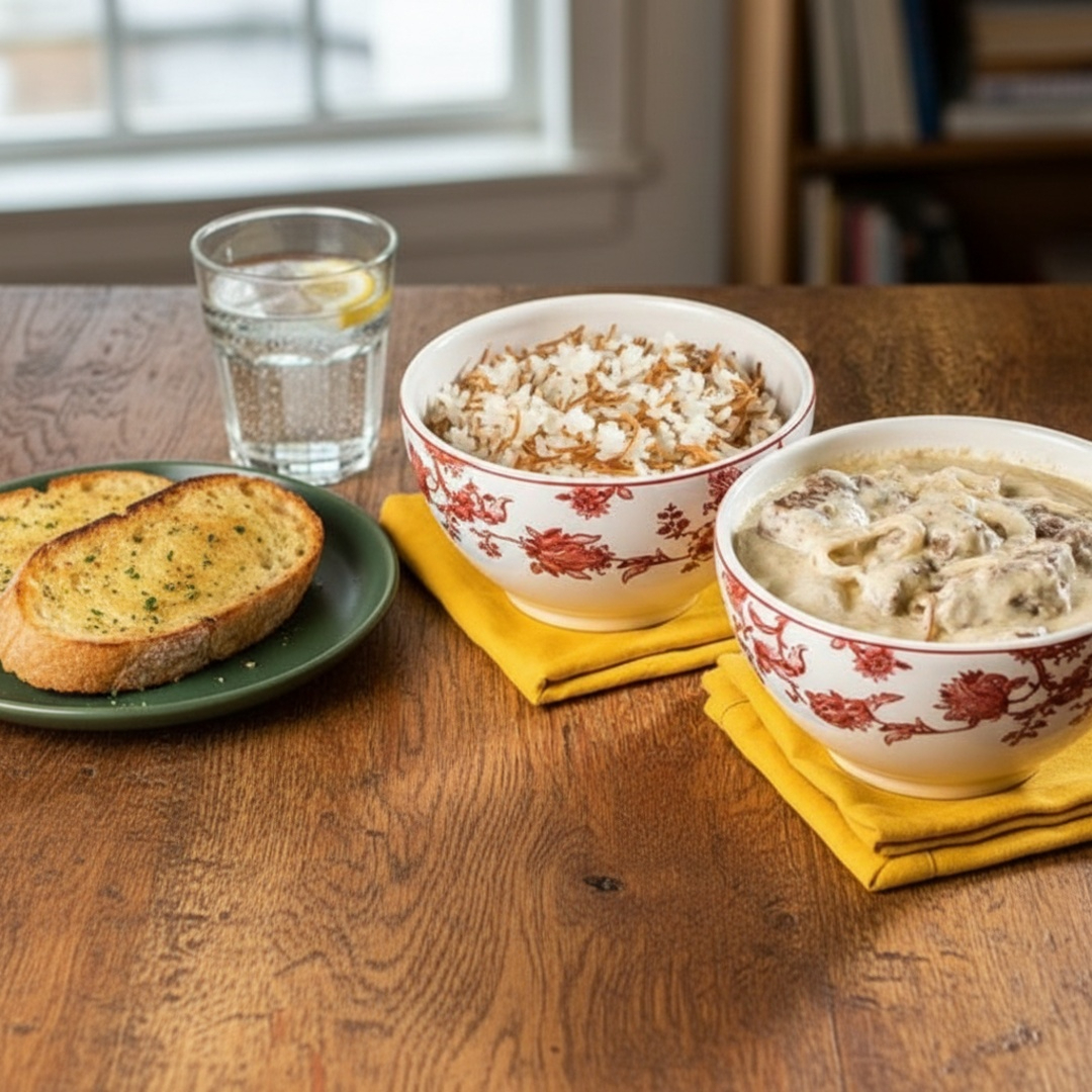 Ragu de fraldinha puxado na coalhada fresca, anéis de cebola douradas. Acompanha arroz chehie