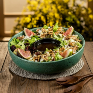 Folhas verdes, figo fresco, nozes torradas, e chancliche, tudo temperado com molho de mel e balsâmico