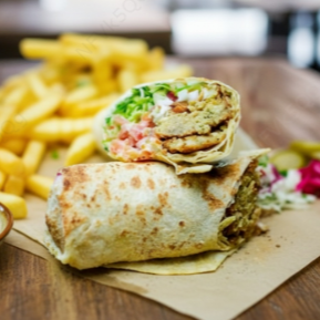 Sanduíche libanês com filé de frango cortado em tiras, coalhada seca e vinagrete, enrolados no nosso delicioso pão folha. Acompanha batatas fritas temperada com zattar e salsa ou saladinha de rúcula.