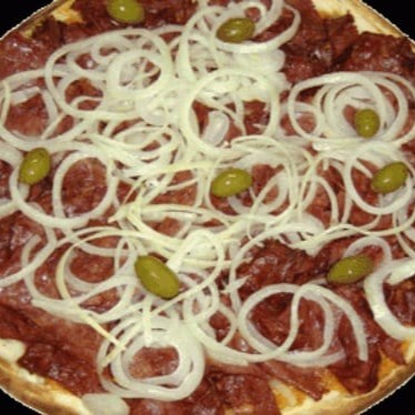 Molho de tomate, calabresa, cebola, orégano e azeitona