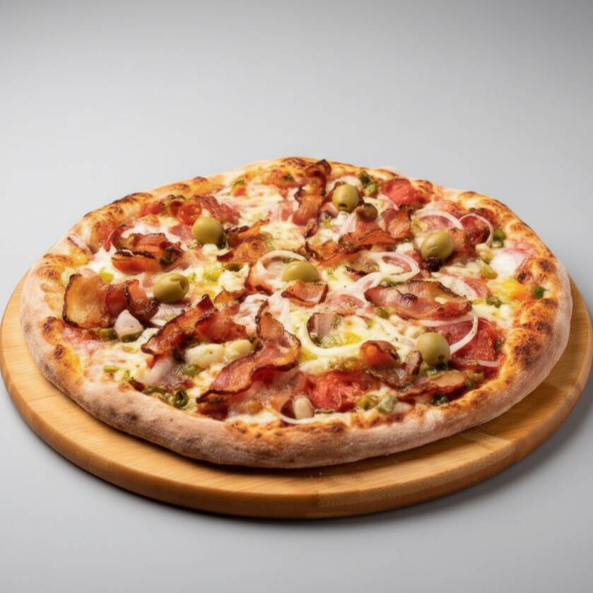 Presunto, calabresa, palmito, cebola, mussarela e Catupiry
