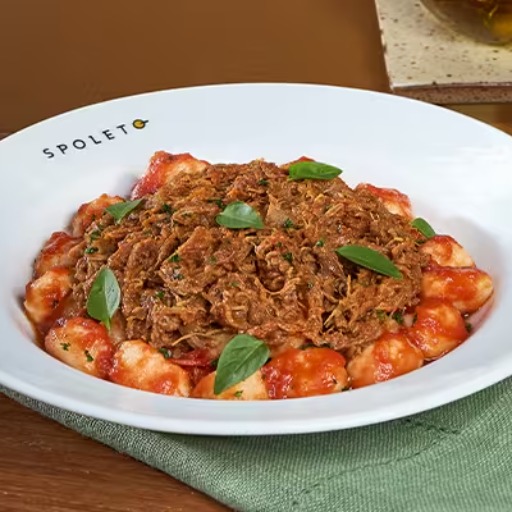 Massa artesanal gnocchi de batatas ao molho pomodoro, com uma porção de 100gr de costela bovina desfiada.