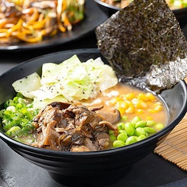 Um exótico Misso Lamen, recheado com um rico mix de cogumelos, meticulosamente temperado com especiarias orientais, apresenta-se como a estrela deste prato. Acompanha um caldo de misso intensamente saboroso, edamame - o nutritivo grão de soja verde - repolho refogado ao ponto, milho crocante, nori e a delicada cebolinha, tudo isso sobre um macarrão tradicional. Para sua comodidade, o caldo é embalado separadamente em uma embalagem própria para micro-ondas, garantindo a perfeita consistência e sa