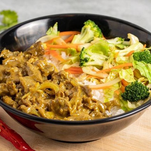 Gohan(arroz japonês) e verdura refogada. Escolha entre carne, frango ou shimeji preto ao molho curry (apimentado)