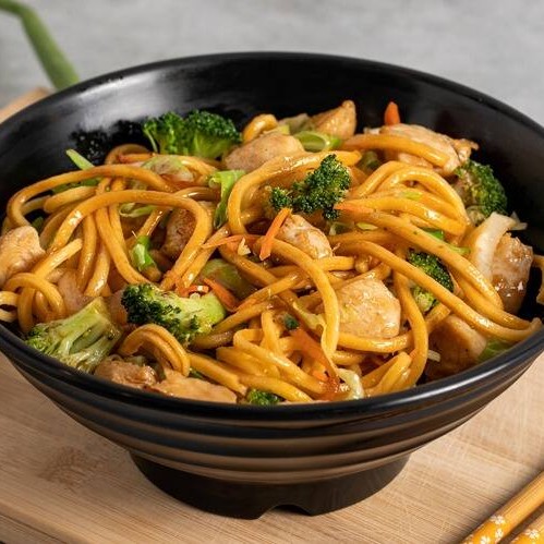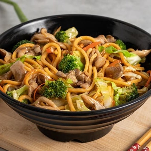 Soboroso yakisoba feito com molho especial Sr Chau, macarrão, verduras e frango.