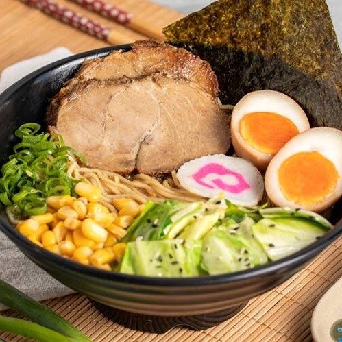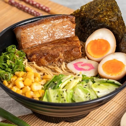 Saboroso Misso Lamen com Chashu, uma especialidade de nossa casa. Esta deliciosa refeição apresenta um caldo à base de missô, enriquecido com macarrão japonês perfeitamente preparado, repolho refogado e chashu, uma tenra carne de porco. Completam o prato toques de cebolinha, ovo cuidadosamente marinado, milho doce e naruto, uma tradicional massa de peixe. Tudo delicadamente salpicado com gergelim para um acabamento perfeito. O caldo é convenientemente embalado separadamente dos outros ingredient