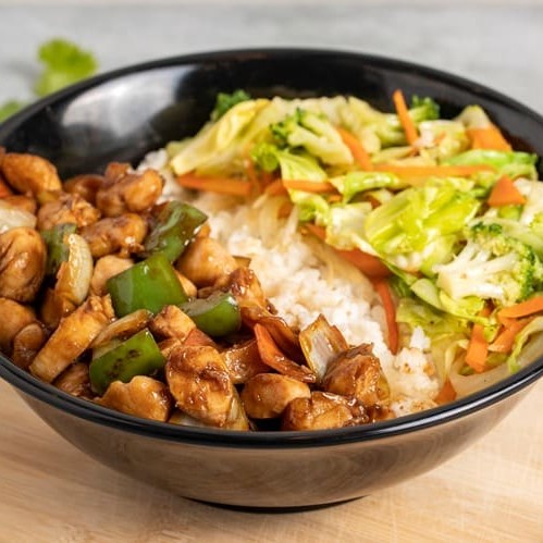Gohan (arroz japonês), verdura refogada e frango xadrez
