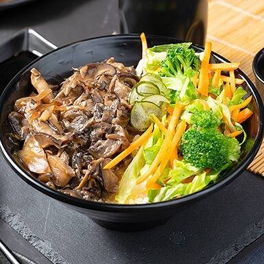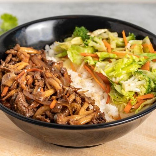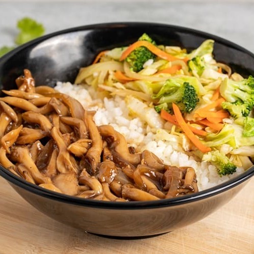 Domburi de mix de cogumelos com molho oriental, legumes refogados e arroz japonês.