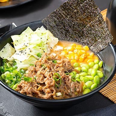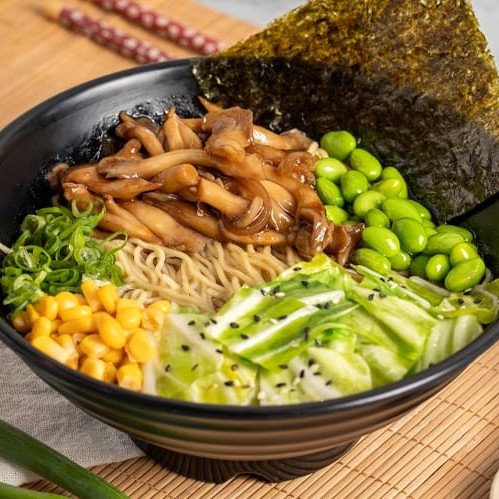 O nosso 'Misso Lamen Vegano' na categoria Lamen, é uma verdadeira sinfonia de sabores. O prato é composto por um caldo à base de missô que proporciona um sabor autêntico e inconfundível. Acompanha nosso macarrão japonês vegano, suave e delicioso. O repolho refogado agrega textura e o shimeji preto ou a carne de jaca, para quem busca uma opção mais exótica, trazem um sabor único. A cebolinha, o edamame (grão de soja verde), o milho e o gergelim adicionam um toque final de frescor e crocância. O c