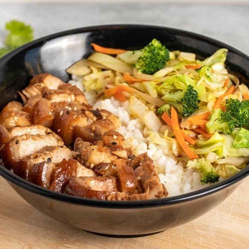 Suculenta panceta marinado no shoyu com temperos da casa, Gohan (arroz japonês) e legumes refogados.