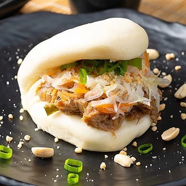 Delicie-se com nosso 'Bao de Carne de Jaca', uma joia do nosso Menu Vegano. Este prato apresenta um pãozinho incrivelmente fofinho, meticulosamente cozido a vapor, recheado com a nutritiva carne de jaca, temperada segundo a tradição da família Chau. Acompanha uma farofa crocante de amendoim adocicada, que equilibra perfeitamente o sabor. Os legumes em conserva, com seu toque agridoce, e a cebolinha fresca adicionam uma explosão de sabores e texturas. Este prato é uma verdadeira homenagem ao temp