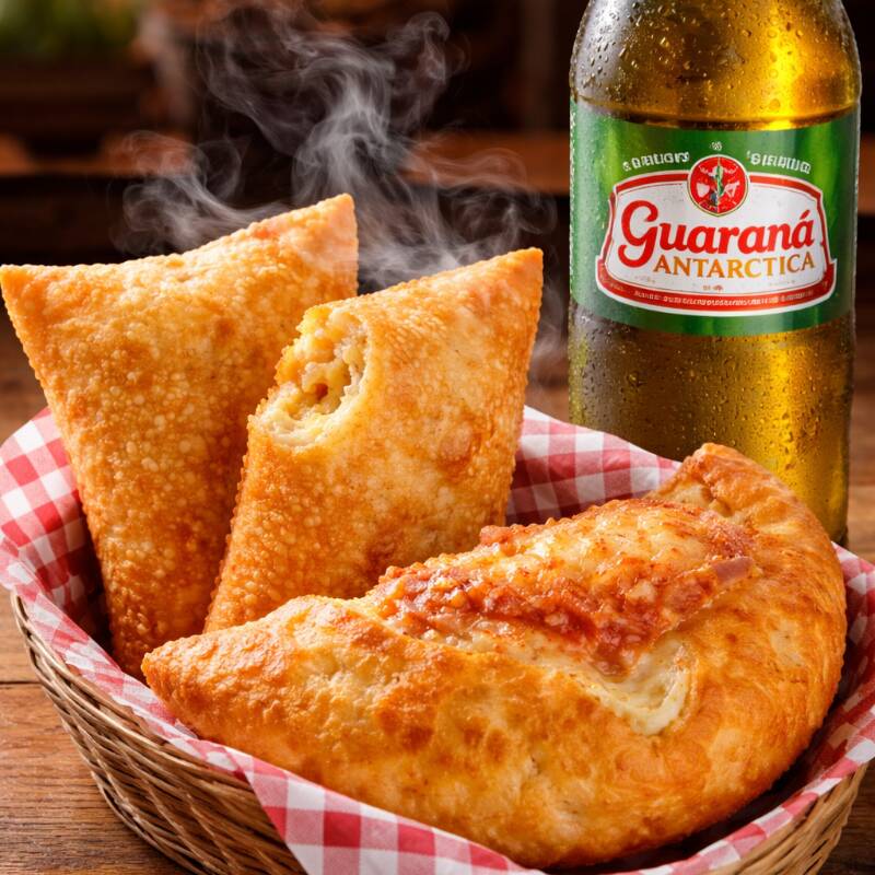 Combo com dois pasteis salgados, uma fogazza doce e um guaraná Antarctica geladinho de 1l