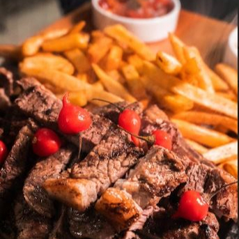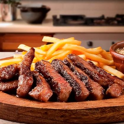 Picanha e Chorizo, batata frita com queijo e bacon, farofa e vinagrete