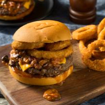 Hamburguer, molho cheddar, cebola caramelizada e farofa de bacon