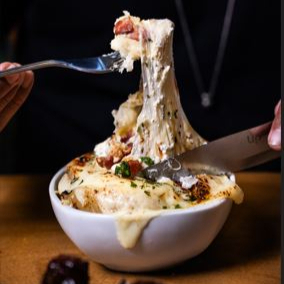 Batata fritas com cobertura de mix de queijos e bacon, acompanha molho Dip Ranch