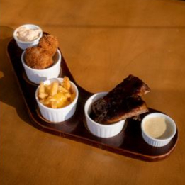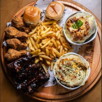 Itens que compõe: 2un de tiras de Star Ribs (costela suina), Batata frita 100g, com bacon e 2un coxinhas de frango acompanhado dos molhos Dip Ranch e Maionese e Bacon