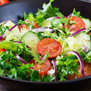 Alface, tomates-cerejas, cenoura, cebola roxa e rabanete