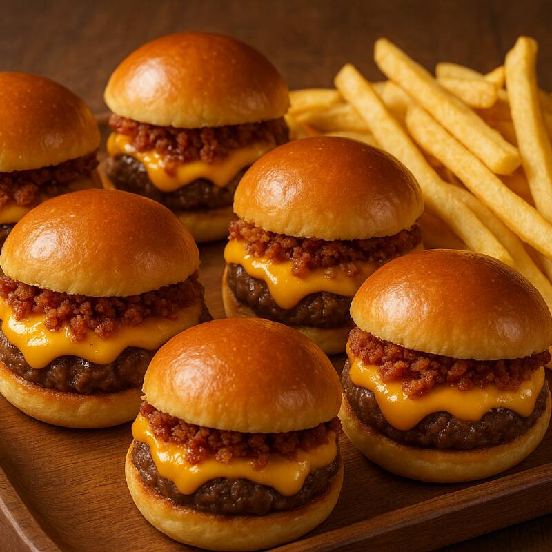 6 mini hamburguers com molho de Maionese e Bacon, Cheedar, e 250g de batatas fritas