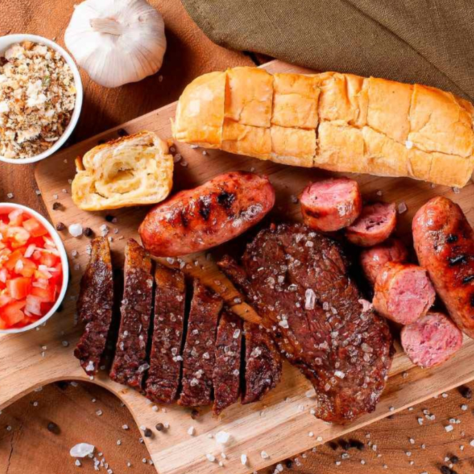 Picanha, Pão de alho, Linguiça toscana,Tulipa, Queijo coalho, Farofa, Vinagrete e Arroz branco