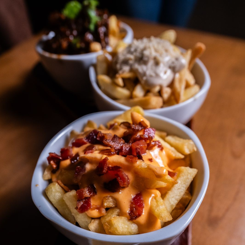 600g de Batatas Fritas + 3 toppings de Cheddar e Bacon, Costela suína com barbecue e Molho de queijo