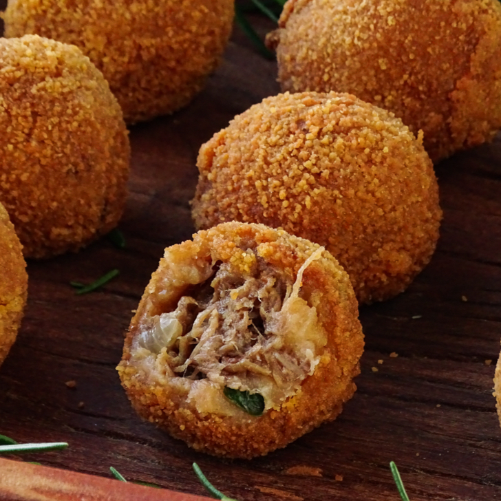 10 coxinhas de frango empanadas, acompanhadas do molho Roquecheese