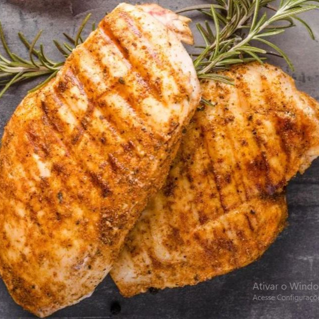 File de frango grelhado, arroz, feijão, batata frita, farofa e vinagrete